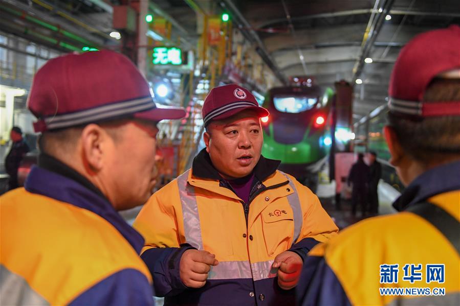 1月9日,在吉林省长春市,中国铁路沈阳局集团有限公司长春电务段长春车载设备车间主任张粤(中)向工友布置当晚作业计划。新华社记者 张楠 摄