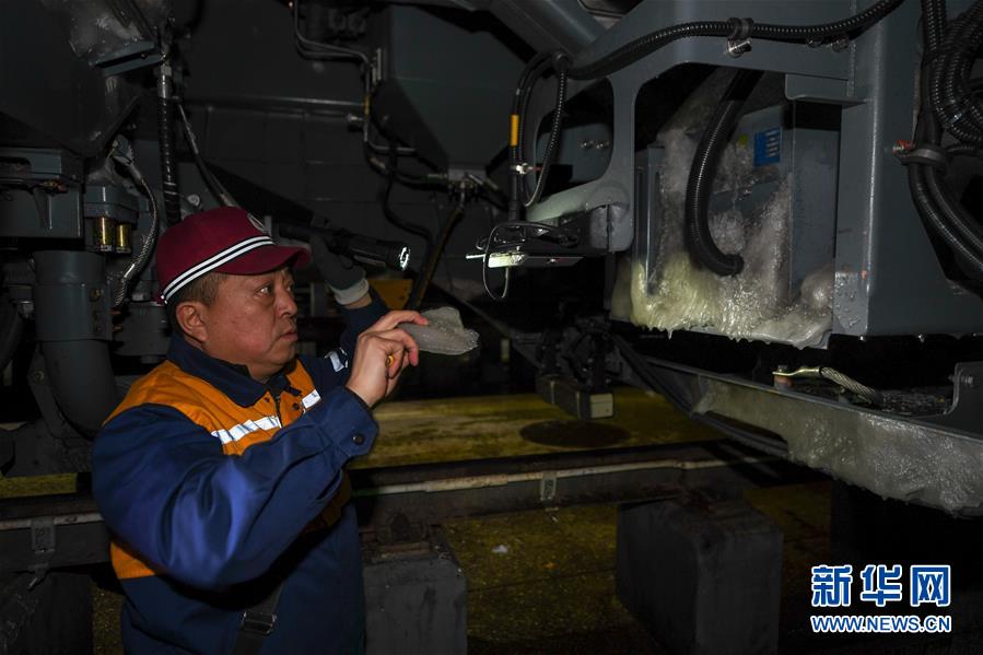 1月9日,在吉林省长春市,中国铁路沈阳局集团有限公司长春电务段长春车载设备车间工人胡建军在去除附着在列车底部电器设备上的冰。新华社记者 张楠 摄