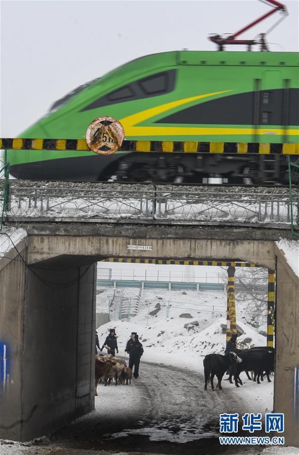 1月9日,乌鲁木齐铁路公安处呼图壁站铁路派出所民警帮助牧民转场。一辆刚投入运营不久的“复兴号”动车组从桥洞上方呼啸而过。 新华社记者 赵戈 摄