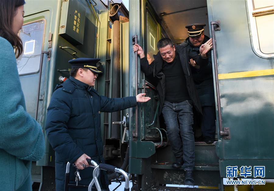 1月7日,列车员帮助行动不便的乘客下车。新华社记者 彭源 摄