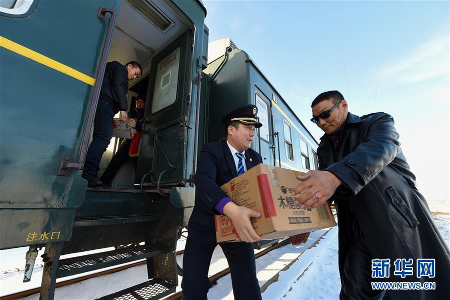 1月7日,列车员穆杰将代购的蔬菜和生活用品交到牧民手中。新华社记者 彭源 摄