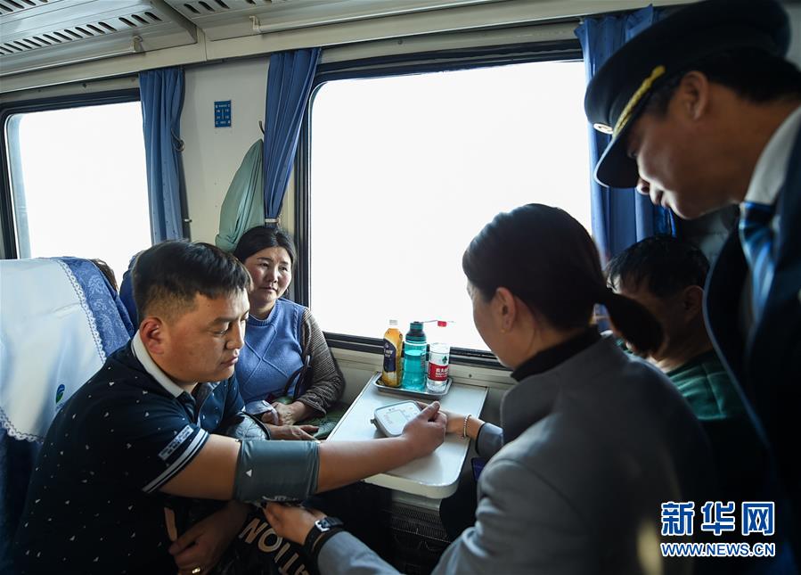 1月7日,列车员在车上为乘客量血压。新华社记者 彭源 摄