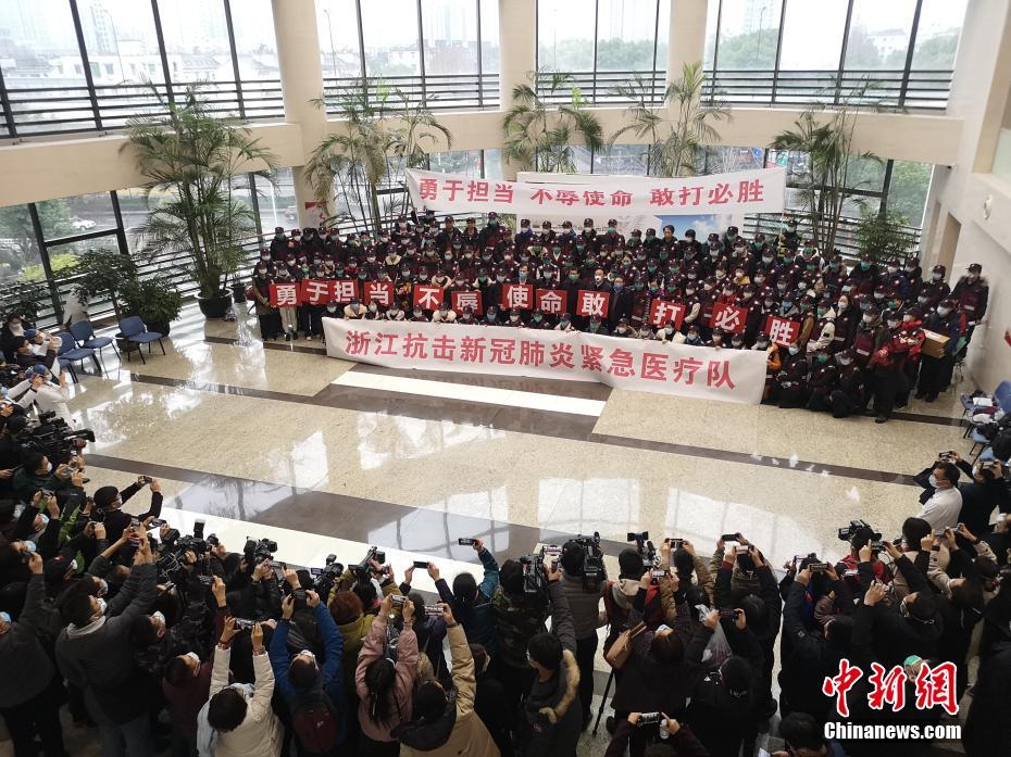 1月25日,出征前医疗队队员合影留念。当日,浙江抗击新型冠状病毒感染的肺炎疫情紧急医疗队共141人(其中医务人员135名,行政管理及后勤人员5名,随队记者1名)出发驰援武汉。中新社记者 张煜欢 摄