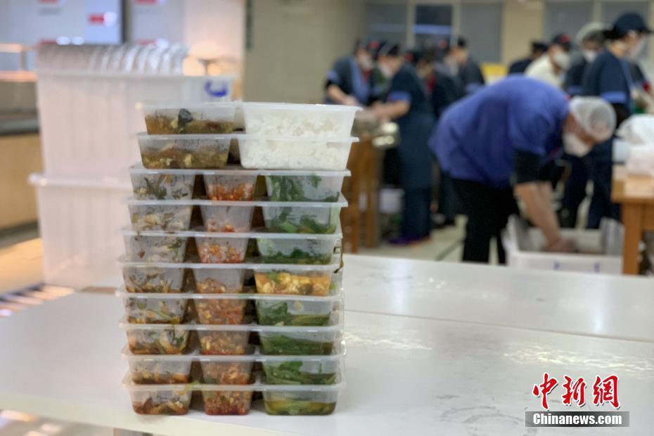 食堂工作人员为医务人员分装除夕夜餐食。中新社记者 杨程晨 摄