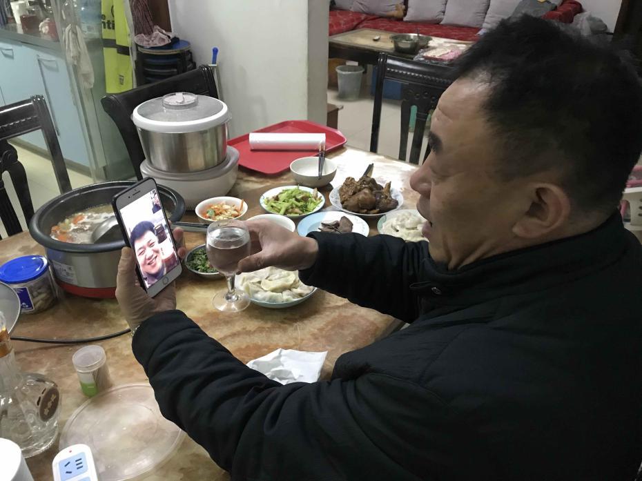 除夕夜,武汉市民选择“宅”在家中,通过手机视频向亲朋好友发出新年的问候,分享各自的“小团圆”。中新社记者 张芹 摄