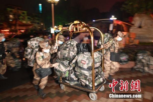 凌晨,支援湖北抗击新型肺炎的450名解放军医疗团队队员及一批医疗物资抵达武汉。李子云 摄