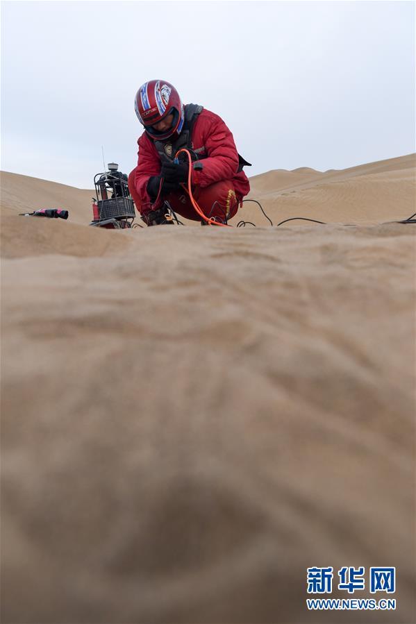韩飞在测线上测试检波器是否正常(1月12日摄)。 新华社记者 丁磊 摄