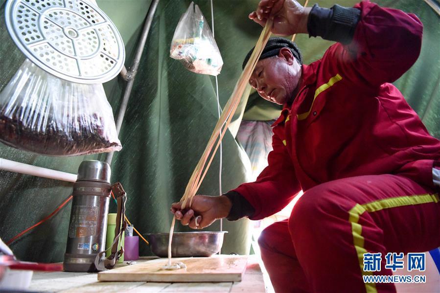 韩付强在帐篷内准备午饭(1月12日摄)。 新华社记者 丁磊 摄