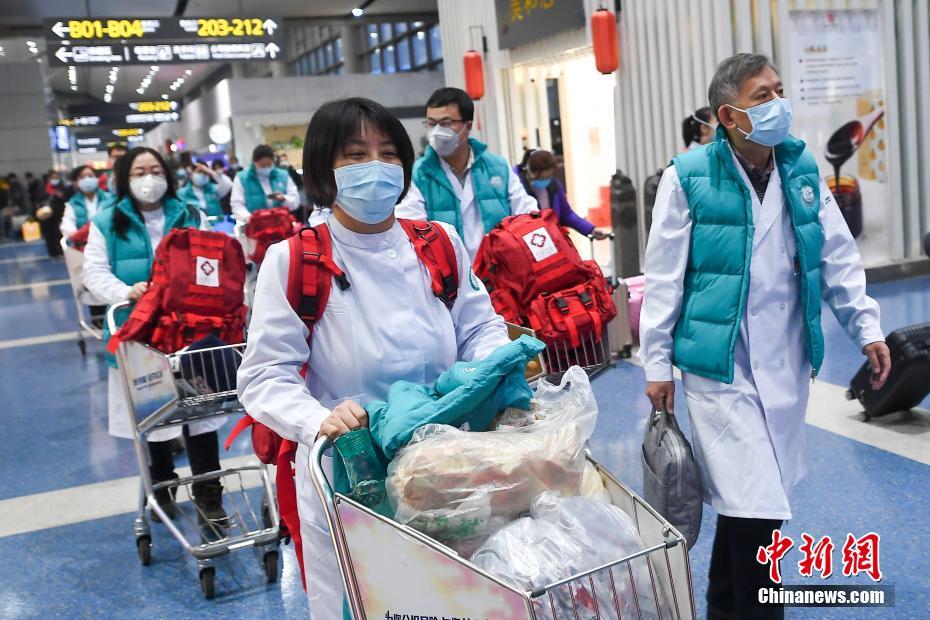 1月26日,山西太原武宿机场,由山西省34所医院重症医学科、呼吸科、感染科的医生、护士等共137人组建的医疗队,奔赴湖北开展新型冠状病毒感染的肺炎医疗救治工作。中新社记者 武俊杰 摄