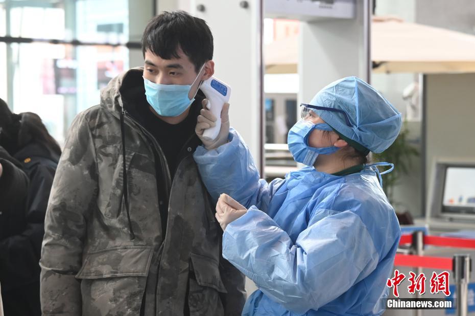 1月27日,受新型冠状病毒感染的肺炎疫情影响,安徽蚌埠南站工作人员为旅客进行体温检测。中新社记者 张兴龙 摄