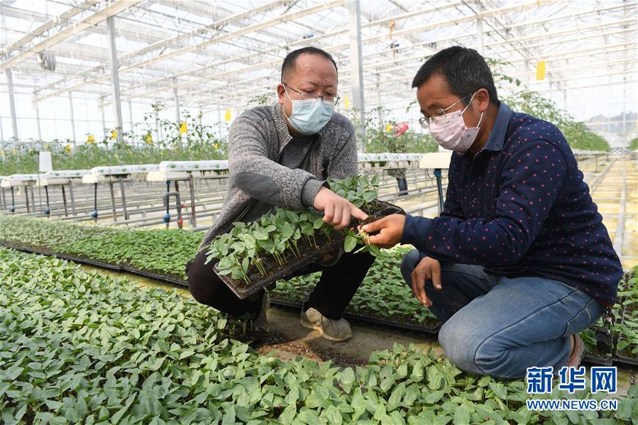 2月26日,江西省科技特派团成员、蔬菜专家熊波(左)在宜春市袁州区南庙镇月之南种植专业合作社向种植户讲解大棚育苗关键技术。 新华社发(周亮 摄)
