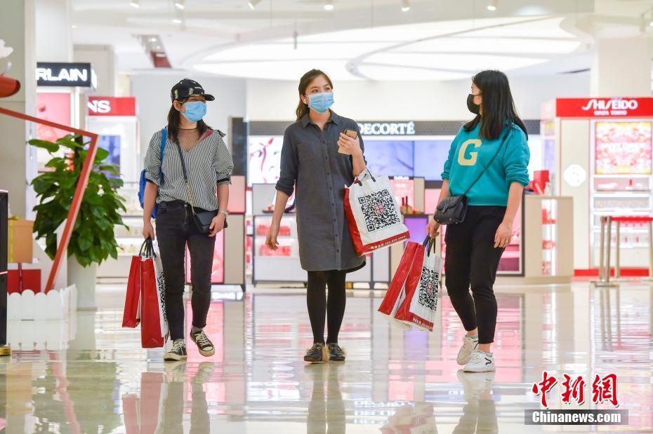 2月27日,民众佩戴口罩在海口日月广场免税店选购免税商品。图为民众佩戴口罩逛免税店。骆云飞 摄