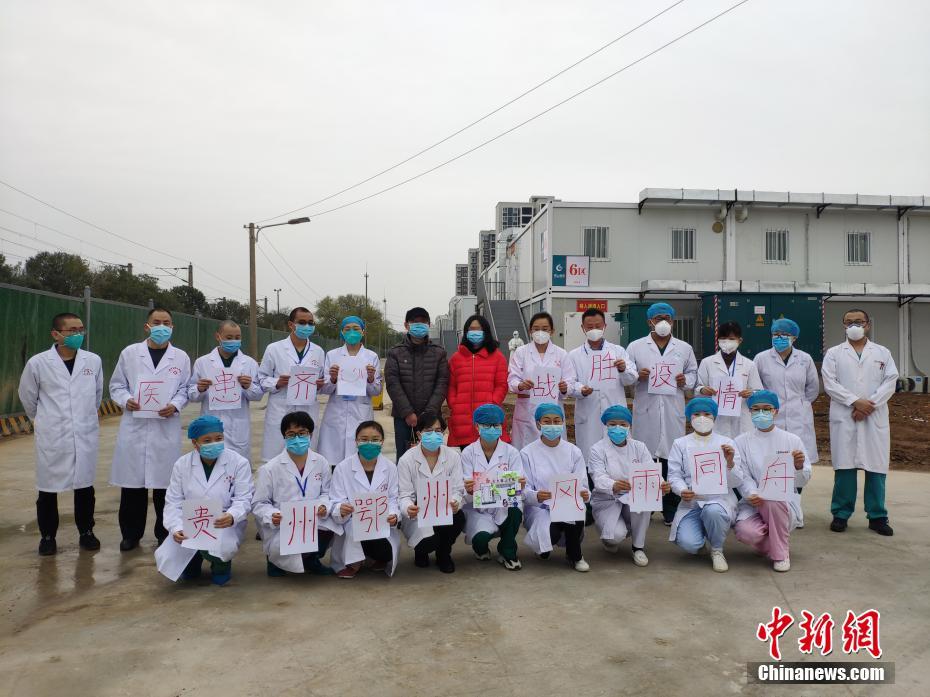 2月27日,湖北省鄂州市鄂州雷山医院二期工程两名新冠肺炎患者达到解除隔离治疗标准,同时出院。据悉,这是自2月21日贵州省医疗队成建制整体支援雷山医院二期工程以来,第一批治愈出院的患者。中新社记者 石小杰 摄