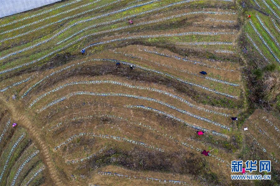 在酉阳县生态茶叶项目建设基地,当地村民在茶山上劳作(2月26日摄,无人机照片)。新华社记者 刘潺 摄