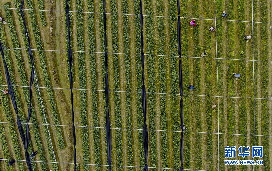 在酉阳县五福镇高桥村油茶苗圃基地内,当地村民在进行除草作业(2月25日摄,无人机照片)。新华社记者 刘潺 摄