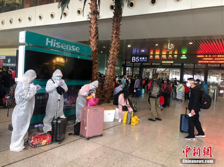 4月8日,武汉正式解除离汉离鄂通道管控措施,武汉站重新开启进站通道,恢复办理旅客进站客运业务。旅客持健康码“绿码”经测量体温、身份核验后可进站乘坐高铁列车。图为“全副武装”出行的旅客。中新社记者 梁婷 摄