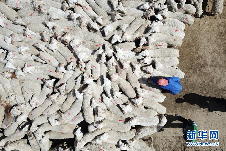 4月8日,在古浪县黄花滩镇黄花滩村,收购商清点收购的肉羊(无人机照片)。 新华社记者 范培珅 摄