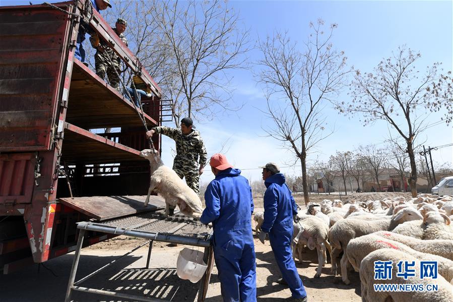 4月8日,在古浪县黄花滩镇黄花滩村,收购商将肉羊装车。 新华社记者 范培珅 摄