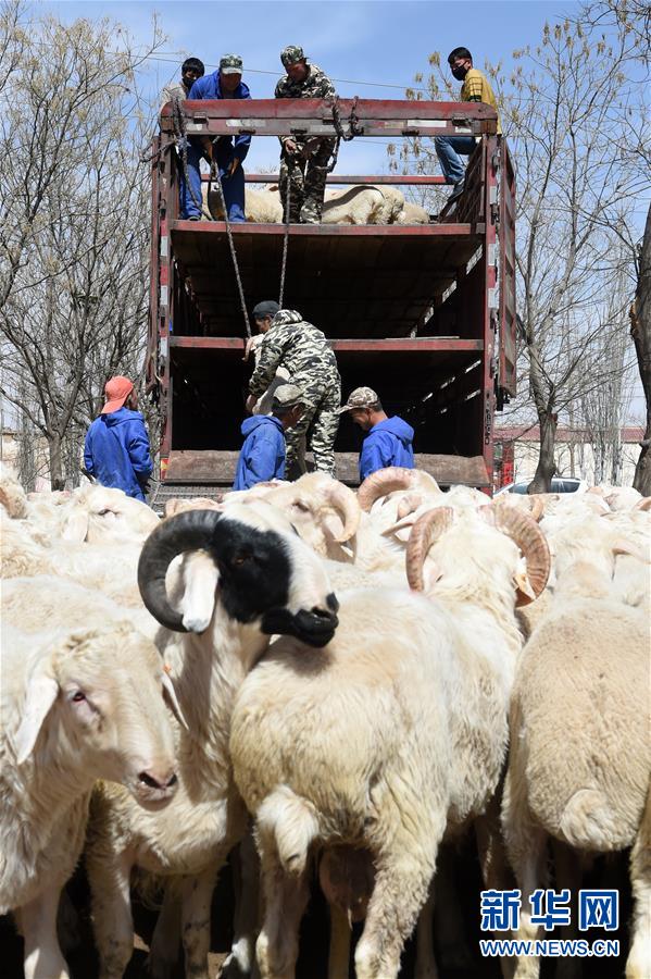 4月8日,在古浪县黄花滩镇黄花滩村,收购商将肉羊装车。 新华社记者 范培珅 摄