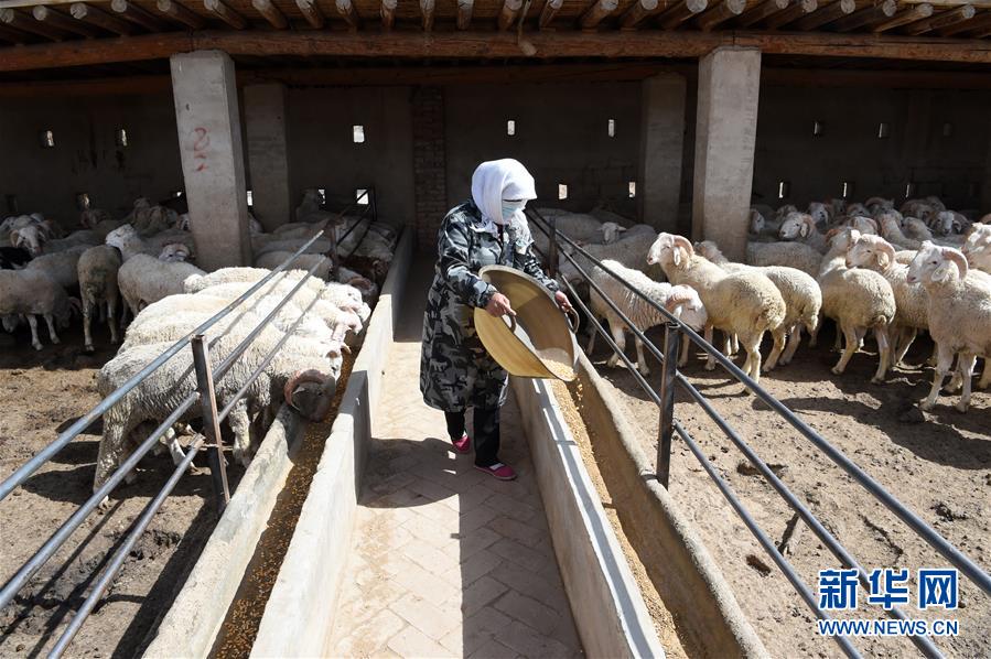 4月8日,在古浪县黄花滩镇黄花滩村养殖小区,农民喂养肉羊。 新华社记者 范培珅 摄