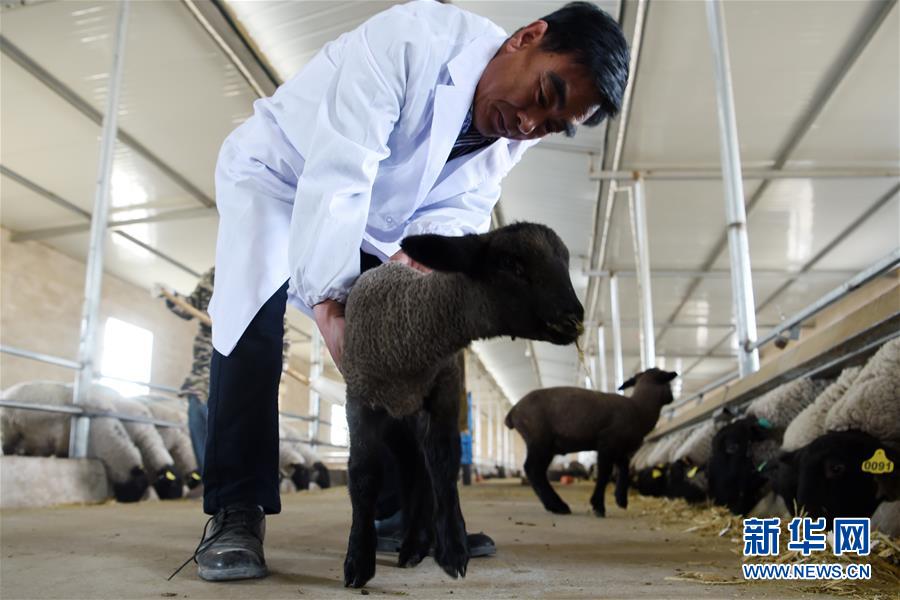 4月8日,在古浪县黄花滩生态移民区兴盛种羊繁育有限公司,负责人胡丛斌检查小羊羔长势。 新华社记者 范培珅 摄