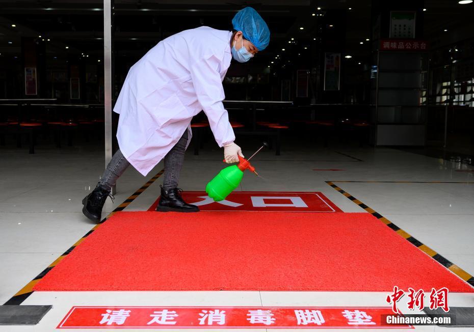 4月9日,山西省太原市,山西财经大学后勤工作人员在食堂进行清洁消毒。按照当地政府安排,山西省高校本硕博毕业年级和高职高专毕业年级分别从4月10日、4月15日起错峰分批开学,一周内基本实现主体开学。中新社记者 韦亮 摄