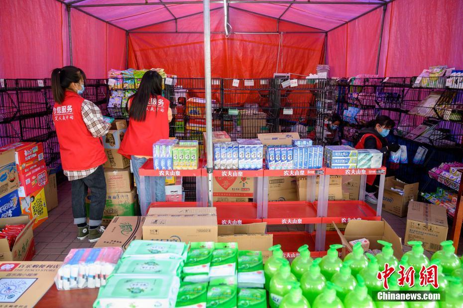 4月9日,山西省太原市,山西财经大学后勤工作人员在校园搭建帐篷超市。按照当地政府安排,山西省高校本硕博毕业年级和高职高专毕业年级分别从4月10日、4月15日起错峰分批开学,一周内基本实现主体开学。中新社记者 韦亮 摄