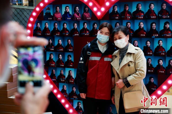 援鄂一线医护人员在摄影展上与“自己”合影留念。 汤彦俊 摄