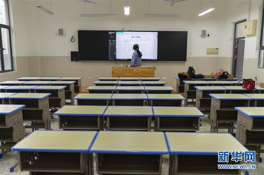 4月10日,襄阳四中一名老师在教室里利用多媒体设备给学生上网课。 近日,随着疫情防控形势持续好转,湖北省襄阳市各学校开展消杀防疫等一系列措施,为复学做准备。襄阳四中根据教学实际情况,在做好校园防疫和老师防护措施的前提下,开始组织部分教师走进教室给学生们上网课。 虽然学生都在家中在线上课,教室略显空荡,但老师们依然声情并茂、认真授课。 新华社发(谢剑飞 摄)