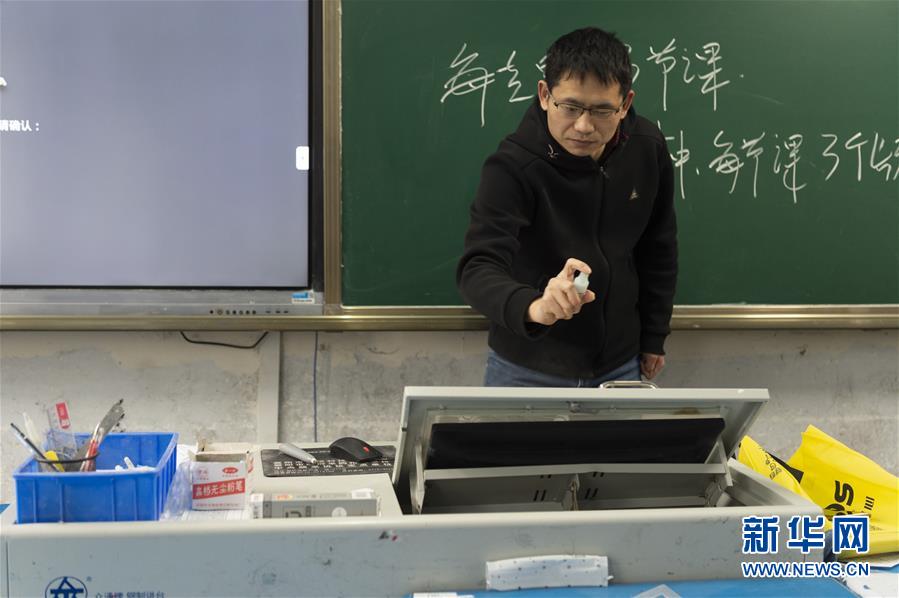 4月10日,在襄阳四中的教室,一名老师在下课后给讲台等区域消毒。 近日,随着疫情防控形势持续好转,湖北省襄阳市各学校开展消杀防疫等一系列措施,为复学做准备。襄阳四中根据教学实际情况,在做好校园防疫和老师防护措施的前提下,开始组织部分教师走进教室给学生们上网课。 虽然学生都在家中在线上课,教室略显空荡,但老师们依然声情并茂、认真授课。 新华社发(谢剑飞 摄)