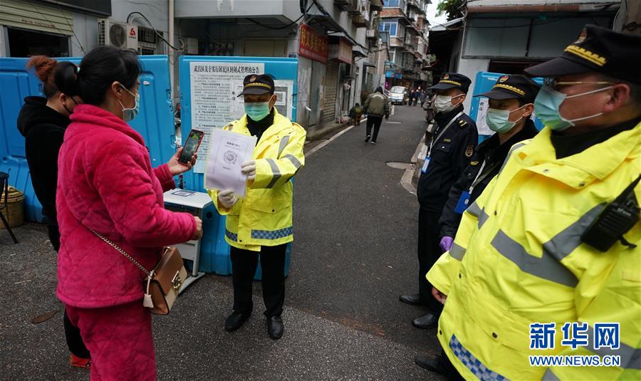 4月11日,武汉城管工作人员在黄鹤楼街大成路大陶家巷执勤,让进入小区的人员扫描健康码。新华社记者 王毓国 摄