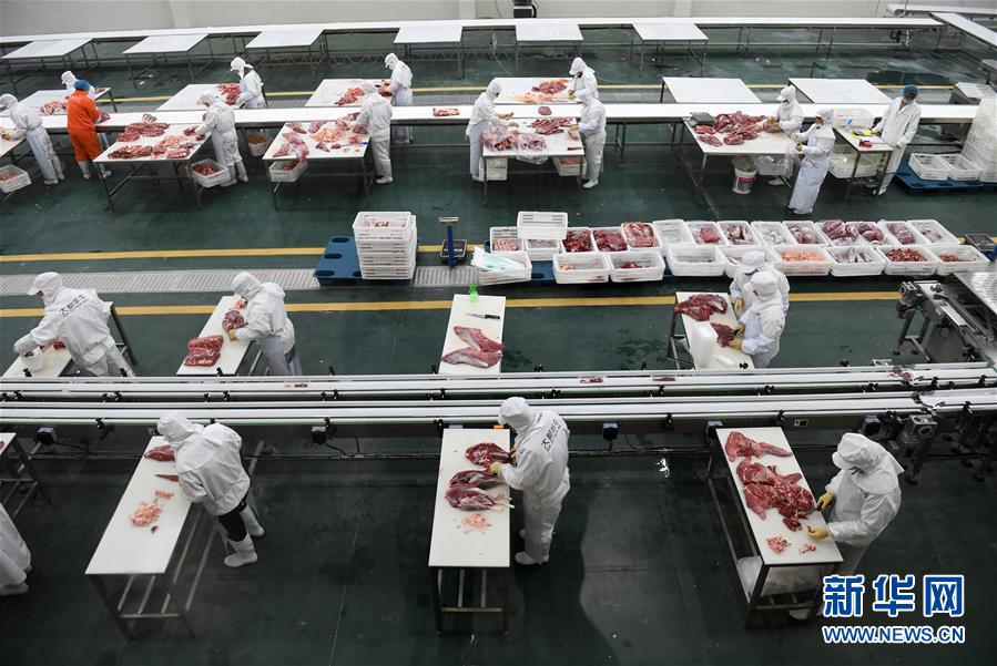 在广西都安县西南冷链仓储物流中心,工人在切割牛肉(2019年7月26日摄)。新华社记者 陆波岸 摄