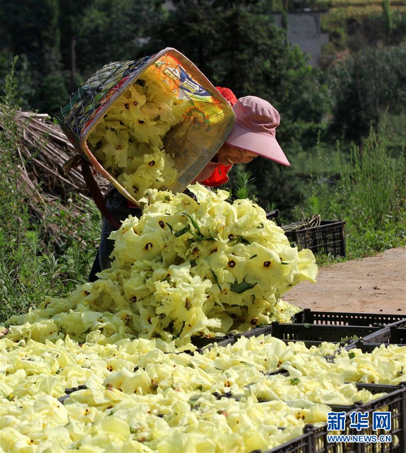 7月30日,在贵州省毕节市黔西县锦星镇东庄村黄蜀葵种植基地,村民忙着背运、装筐刚采摘的中药材黄蜀葵花。 新华社发(史开心 摄)
