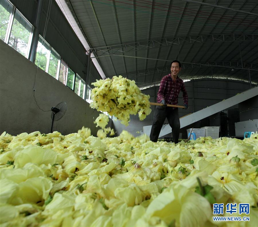 7月30日,在贵州省毕节市黔西县黄蜀葵花烘干车间,村民把运到的中药材黄蜀葵花送进烘干机里。 新华社发(史开心 摄)
