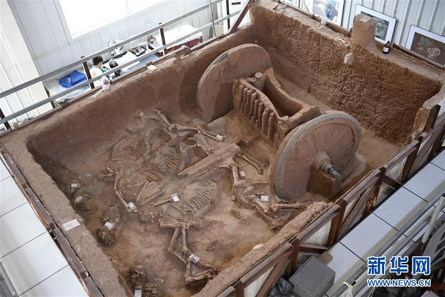 这是7月30日在陕西省考古研究院泾渭基地拍摄的西周晚期青铜轮牙马车。 经过文物保护人员3年多连续不断的保护修复,一套总长超过3米的西周晚期青铜轮牙马车已保护和复原完毕。 这套青铜轮牙马车2014年出土于陕西省宝鸡市岐山县周原遗址,马车长3.13米、宽2.7米、高1.5米,车头部位有4匹马的遗骸。马车车厢装饰华丽繁复,有大量镶嵌绿松石的青铜构件、薄壁青铜兽面装饰以及玉器和彩绘构件,车轮外沿全部由青铜铸造而成,这也是目前唯一一套部件完整的青铜轮牙马车。 根据实验室提取的遗物和精确数据,考古工作者按照原来的工艺、结构对这辆青铜轮牙马车进行了同比例复原。这套青铜轮牙马车的保护和复原,对研究西周晚期的礼仪及车舆制度有重要价值。 新华社记者 李一博 摄 图片来源:新华网