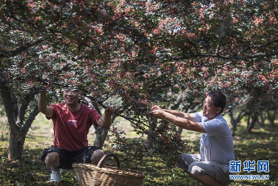 7月30日,渭南市华州区大明镇下李村村民在花椒地里采摘花椒。 该村有花椒2000多亩,仅此一项人均产值达6300余元,大部分群众以此脱贫致富。 新华社记者 陶明 摄