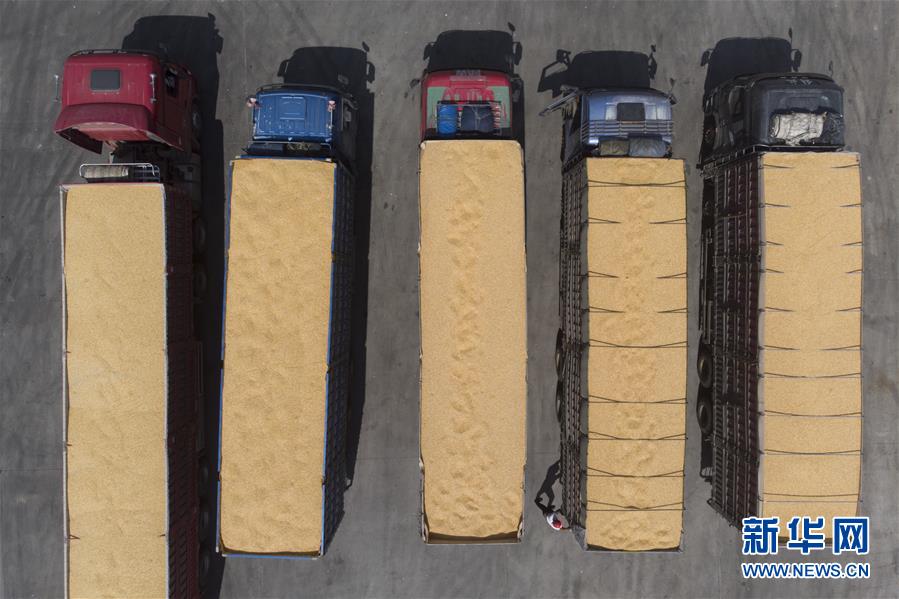 这是在黑龙江伊品生物科技有限公司内拍摄的装载玉米的卡车(7月30日摄,无人机照片)。 近年来,黑龙江省大庆市杜尔伯特蒙古族自治县积极发展玉米深加工产业,引进行业龙头企业,调整农业种植结构,带动全县及周边地区玉米种植户增收,同时也带动了物流业、服务业等其他领域发展。 新华社发(张涛 摄)
