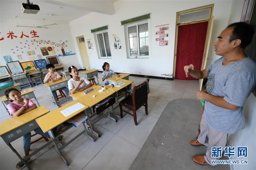 9月8日,冯东海(右一)在河北省邯郸市广平县特教学校课堂为学生上课。 新华社发(程学虎 摄)
