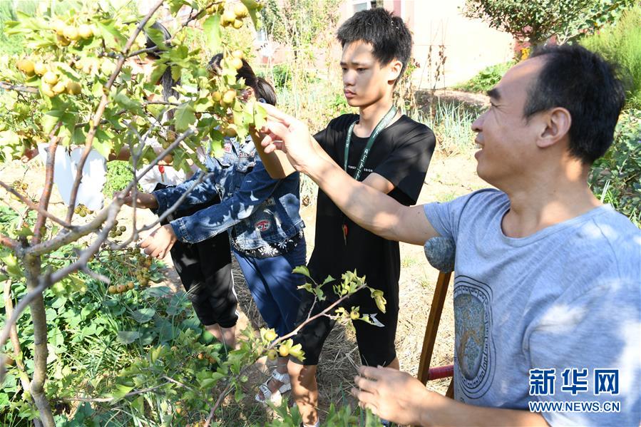 9月8日,冯东海(右一)在河北省邯郸市广平县特教学校为学生讲解农作物知识。 新华社发(程学虎 摄)