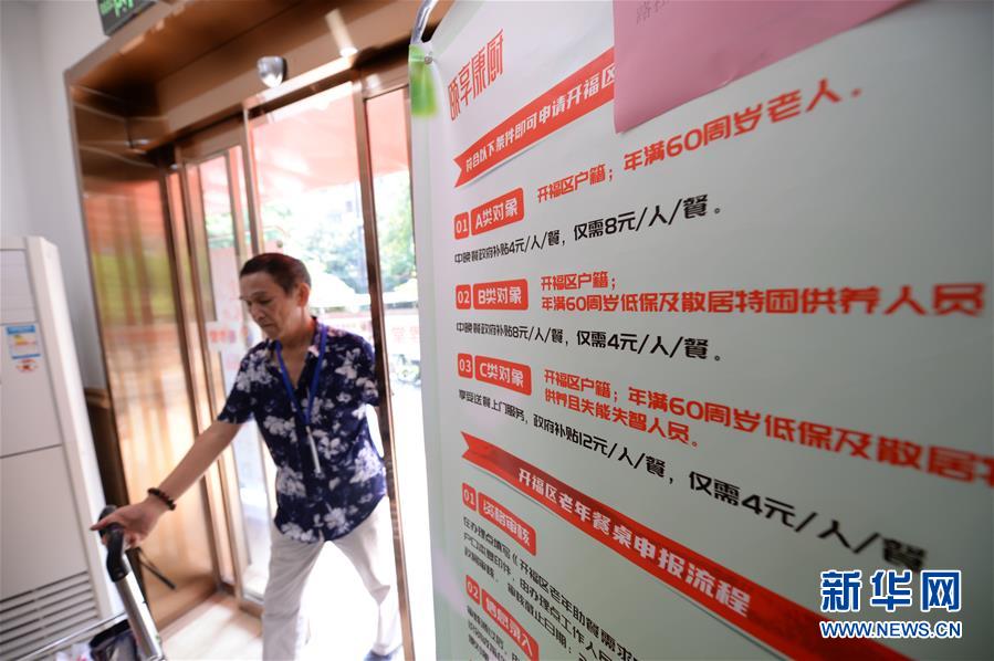 9月9日,老人走进开福区砚瓦池社区“老年餐桌”准备用餐。新华社记者 陈振海 摄