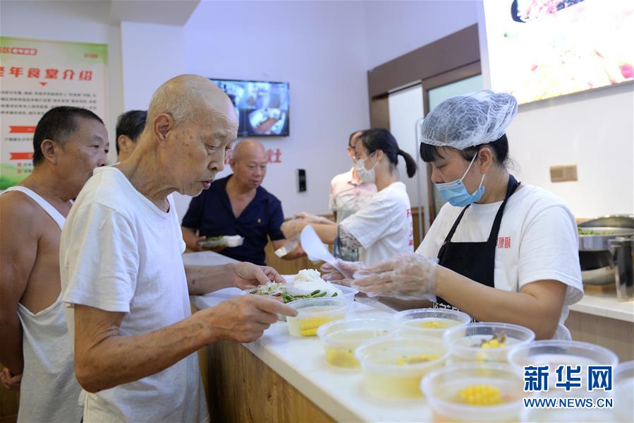 9月9日,开福区砚瓦池社区“老年餐桌”工作人员在为老人盛菜。新华社记者 陈振海 摄