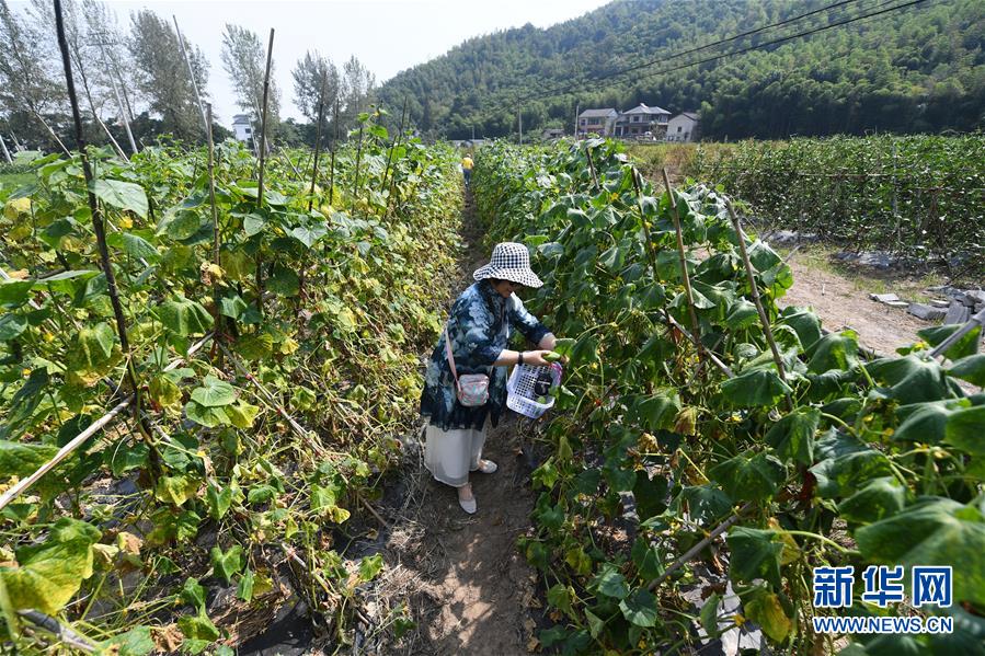 9月9日,鄣吴镇幸福城康养社区的老人在生态农场采摘蔬菜。这片60多亩的蔬菜地是康养社区生态农场的一部分,产出的有机蔬菜用于老人们的日常餐饮。新华社记者 徐昱 摄