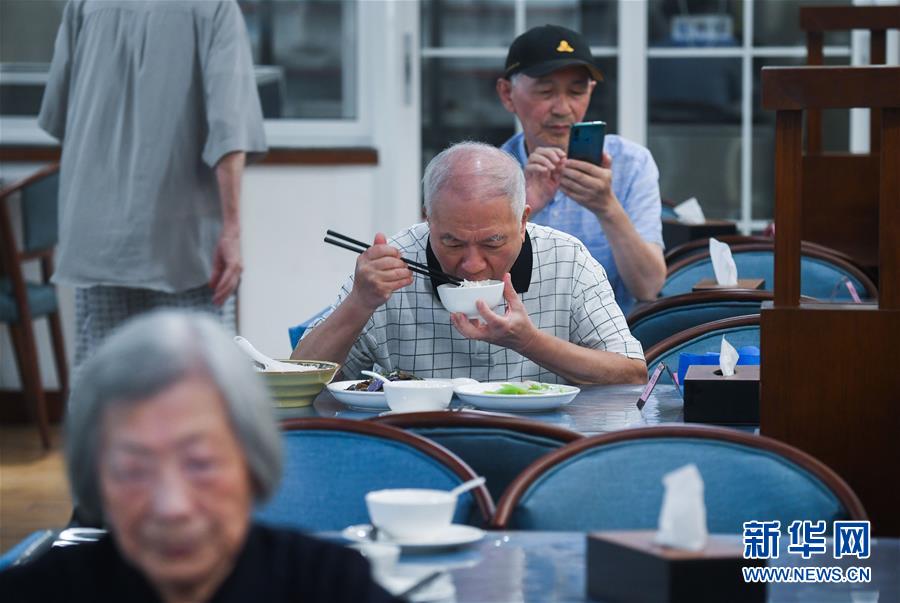 9月9日,鄣吴镇幸福城康养社区的老人们在餐厅用餐。该社区的老人们大多数来自于上海、杭州等周边城市。新华社记者 徐昱 摄