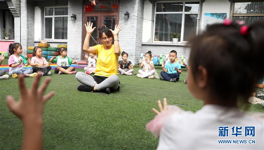 9月9日,幼教老师在大梨树村萌芽幼儿园里带领孩子们游戏。 辽宁省丹东市凤城市大梨树村曾是一个贫穷落后小山村。多年来,大梨树人发扬苦干、实干、巧干的精神,坚持集体经济与民营经济同步发展,农工商旅一体化推进,如今已发展成总资产16亿的“美丽乡村”,村民就业率达百分之百。 新华社记者 姚剑锋 摄