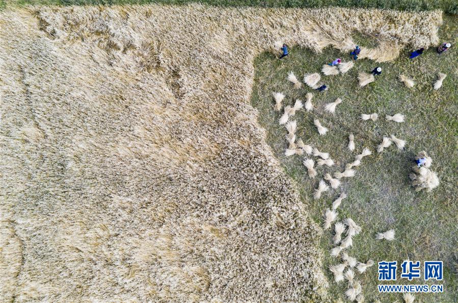 西藏拉萨市墨竹工卡县农民在秋收(9月9日摄,无人机照片)。 时下,拉萨河谷一带迎来秋收季。空中俯瞰拉萨河谷,阡陌间遍地金黄,山河壮美如画。 新华社记者 普布扎西 摄