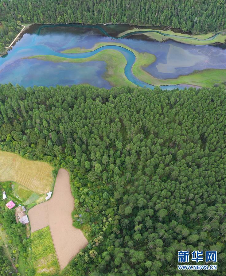 这是林芝市波密县草湖风景(9月9日摄,无人机照片)。 草湖位于西藏林芝市波密县岗云杉林景区,这里秋季雨水充沛,在原始森林的包围中显得格外神秘与美丽。 新华社记者 普布扎西 摄