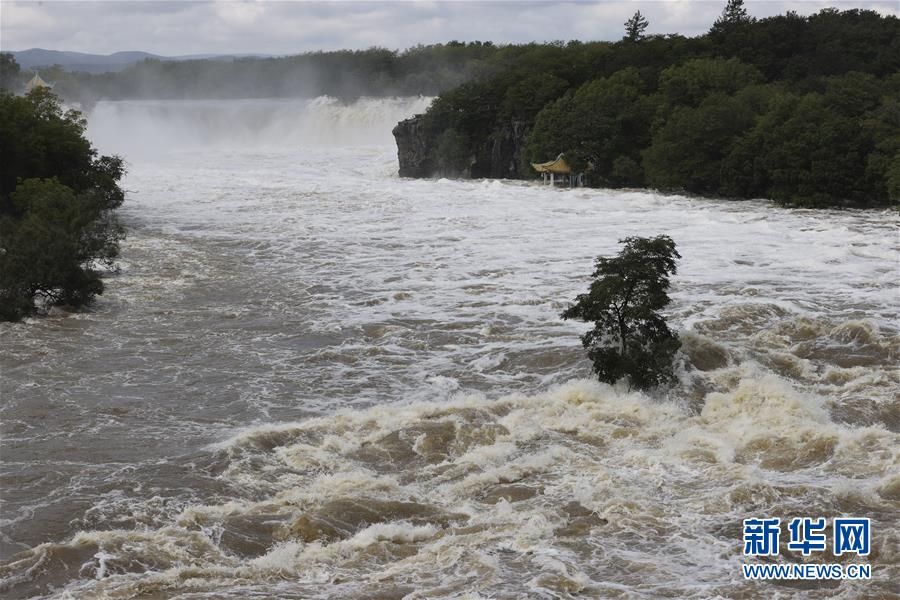 9月10日,牡丹江市镜泊湖的吊水楼瀑布出现“三面溢流”的景象。 新华社发(张涛摄)