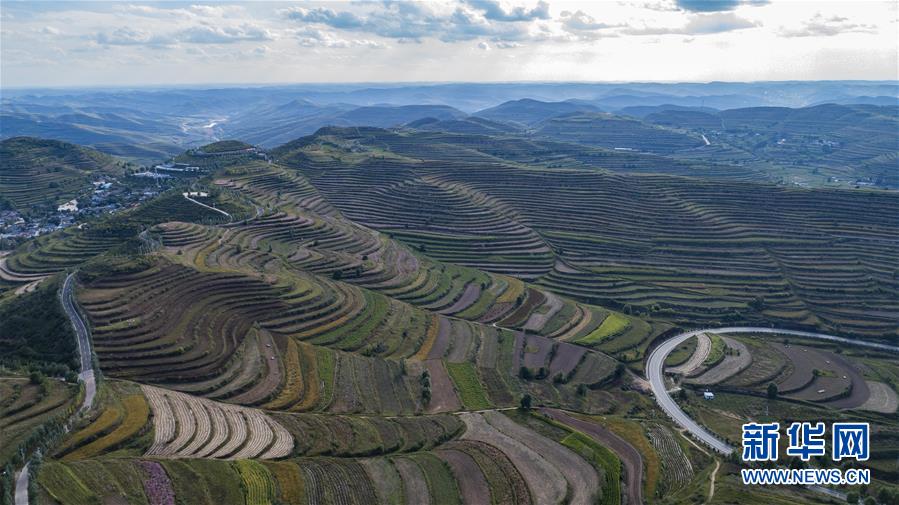 初秋时节,位于宁夏南部山区的固原市西吉县,格桑花、荞麦花竞相绽放,胡麻、莜麦等小杂粮长势喜人,色彩纷呈的旱作梯田层层叠叠,环绕着山脚下的村落,构成美丽的田野画卷。