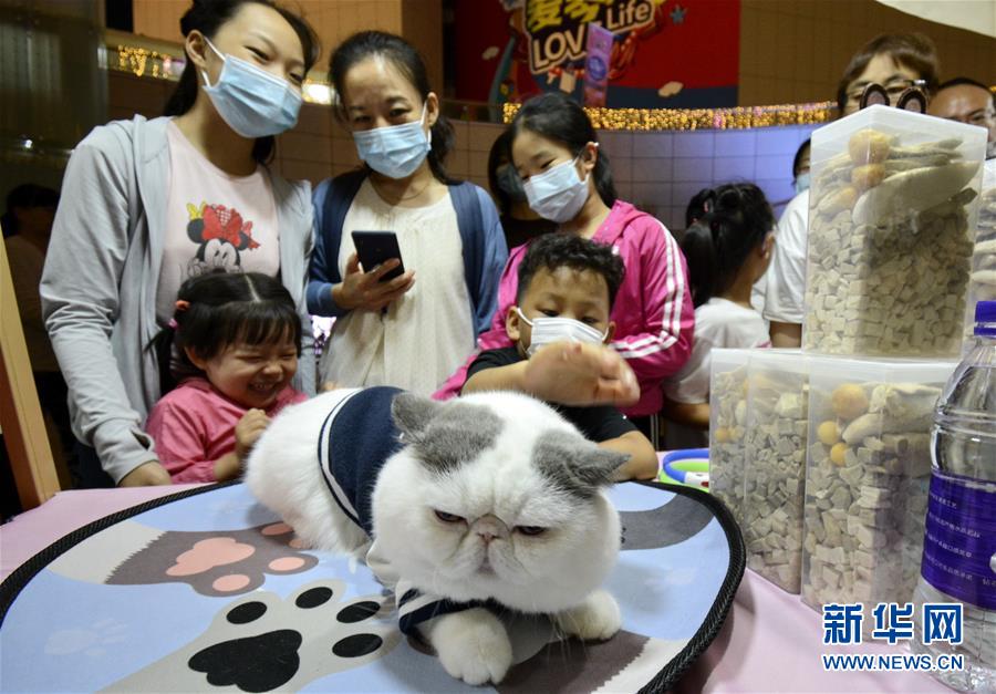 9月12日,市民在北京大兴爱琴海购物公园夜市观看商家展出的宠物猫。 当日,北京市大兴区旧宫镇“夜巷京南”休闲购物文化夜市在北京大兴爱琴海购物公园开幕。此次夜市活动是“2020年全国消费促进月暨北京时尚消费月”的组成活动之一。 新华社记者 李欣 摄