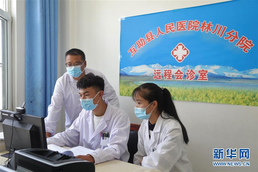 在青海省海东市互助土族自治县林川卫生院远程会诊室,医生盛生凯(左二)和同事在连线互助县人民医院专家(9月10日摄)。新华社记者 央秀达珍 摄